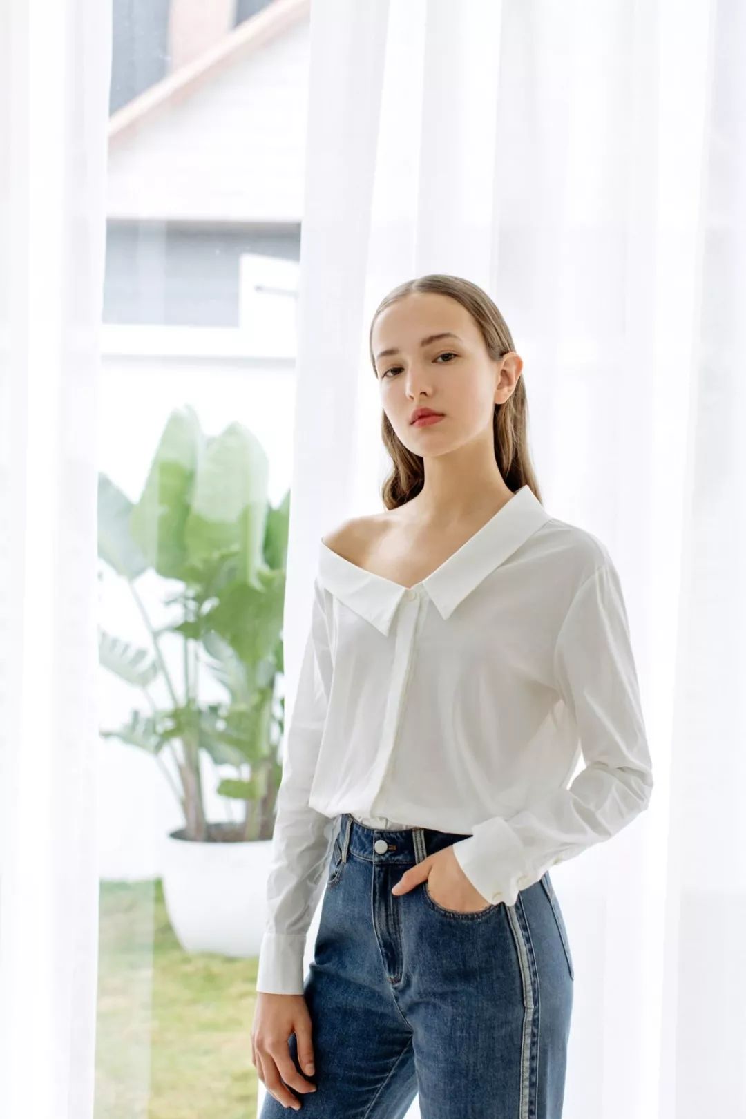 一件很大胆的白衬衫,是露单肩设计的,不用担心它会掉,版型调整了很多次,大多数人都能穿。面料透气,扣子是精致的白蝶贝,细节也要精美。▼