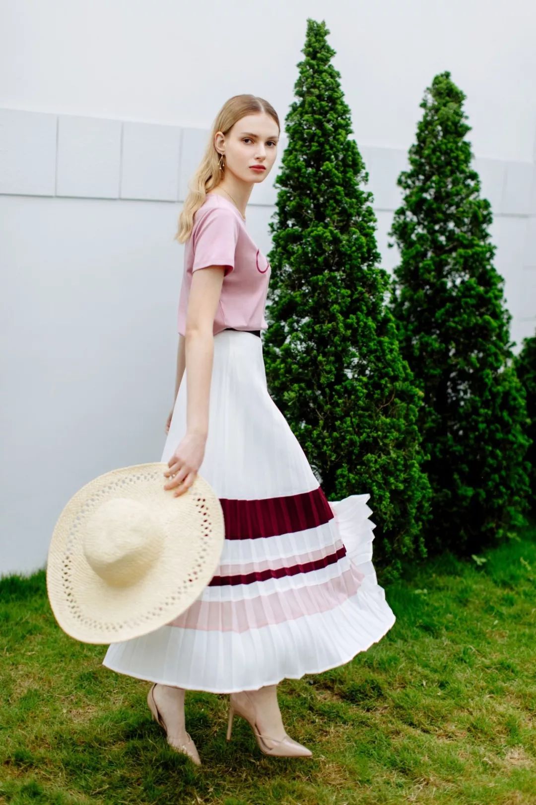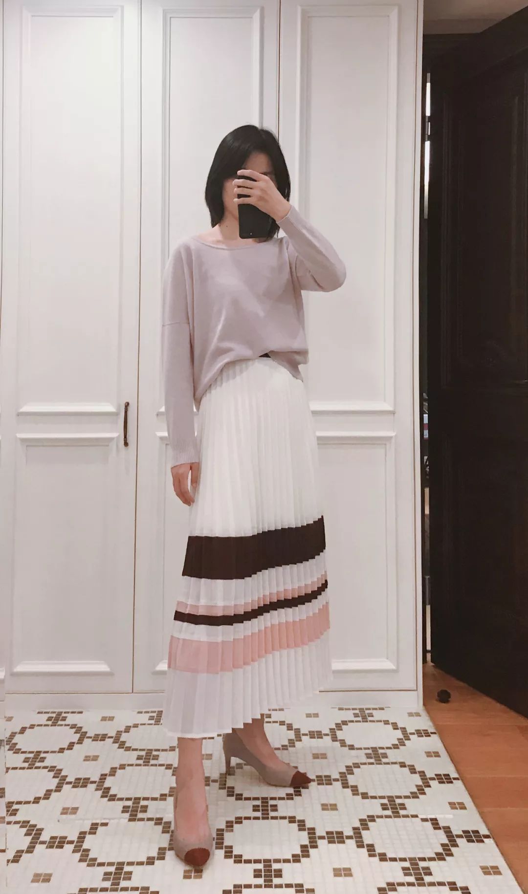 这条拼色百褶裙复古高腰设计,垂坠感很好。▼