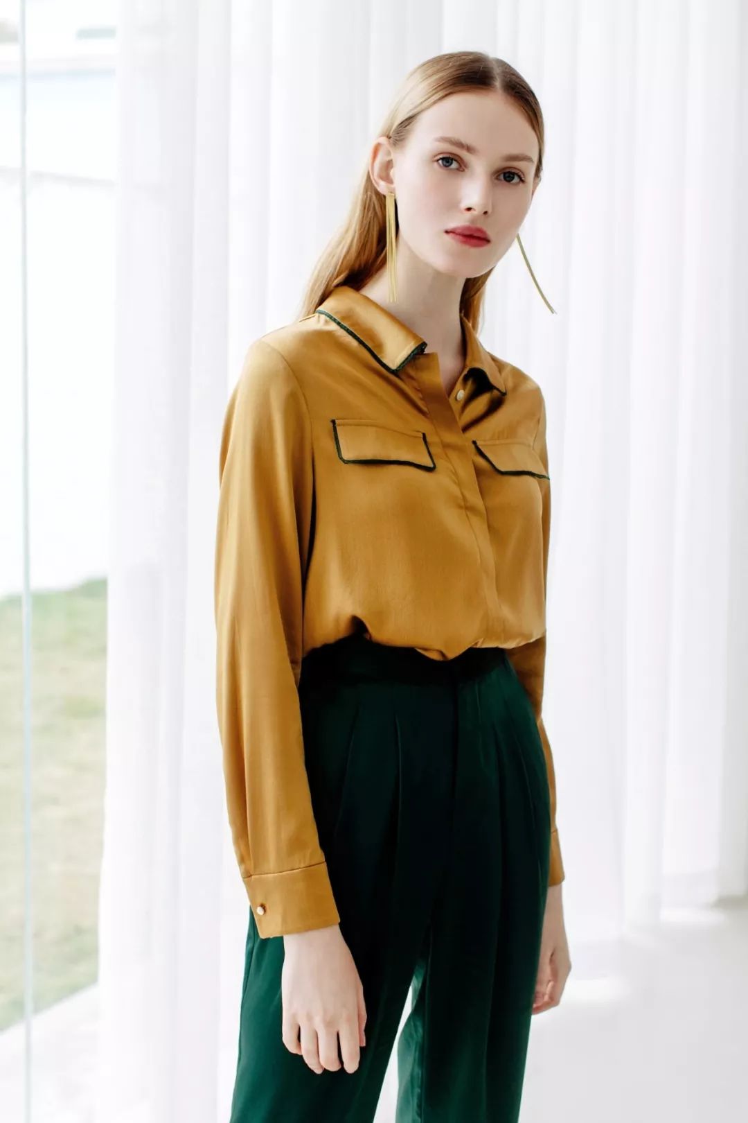 这件衬衫是黄绿撞色,复古优雅。两个口袋设计,让它多一点帅气值。▼