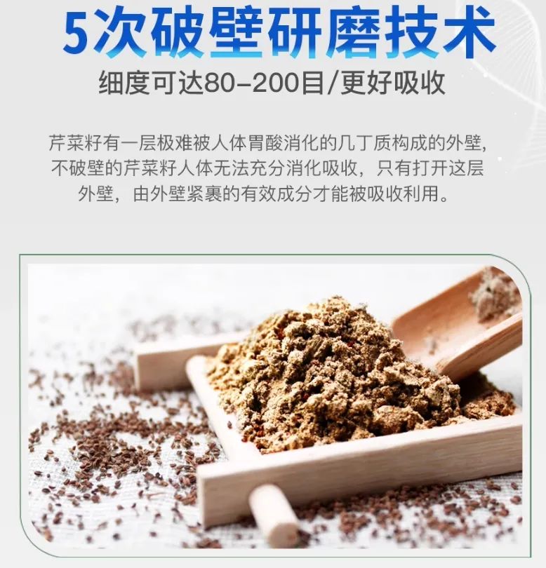 寻草纲目团队经过2年潜心配伍,结合现代超微破壁技术,配料添加芹菜籽,经过5次超微反复破壁,补得进、好吸收。