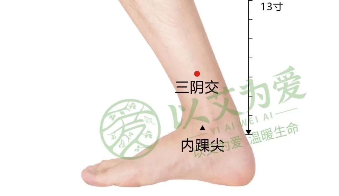 1、三阴交:所谓“妇科三阴交”,此穴对妇症甚有疗效,经期不顺,白带,月经过多,过少,经前综合症,更年期综合症等,均可艾灸此穴!