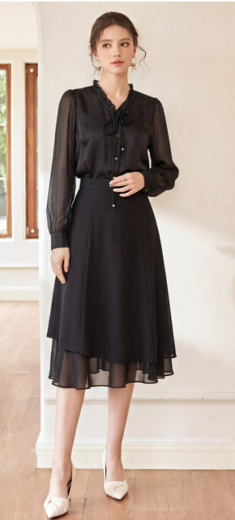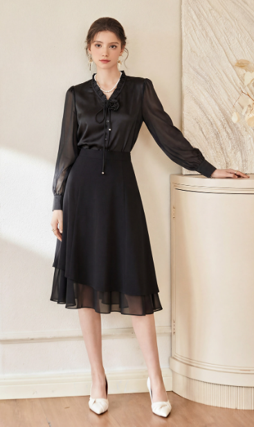 它兼顾质感与实穿。细腻垂感面料,自带高级光泽感,单穿精致利落,单配西装外套或针织开衫,瞬间提升穿搭精致度。亲肤透气的材质,久坐办公也无束缚感,精致金属系带吊坠点缀,细节处尽显品味。