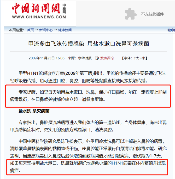 早在2019年中国新闻网的《甲流多由飞沫传播感染用盐水漱口洗鼻可杀病菌》报道中就指出:每天坚持用盐水漱口、洗鼻就能很好地避免少量的H1N1病毒在体内繁殖并出现病症。