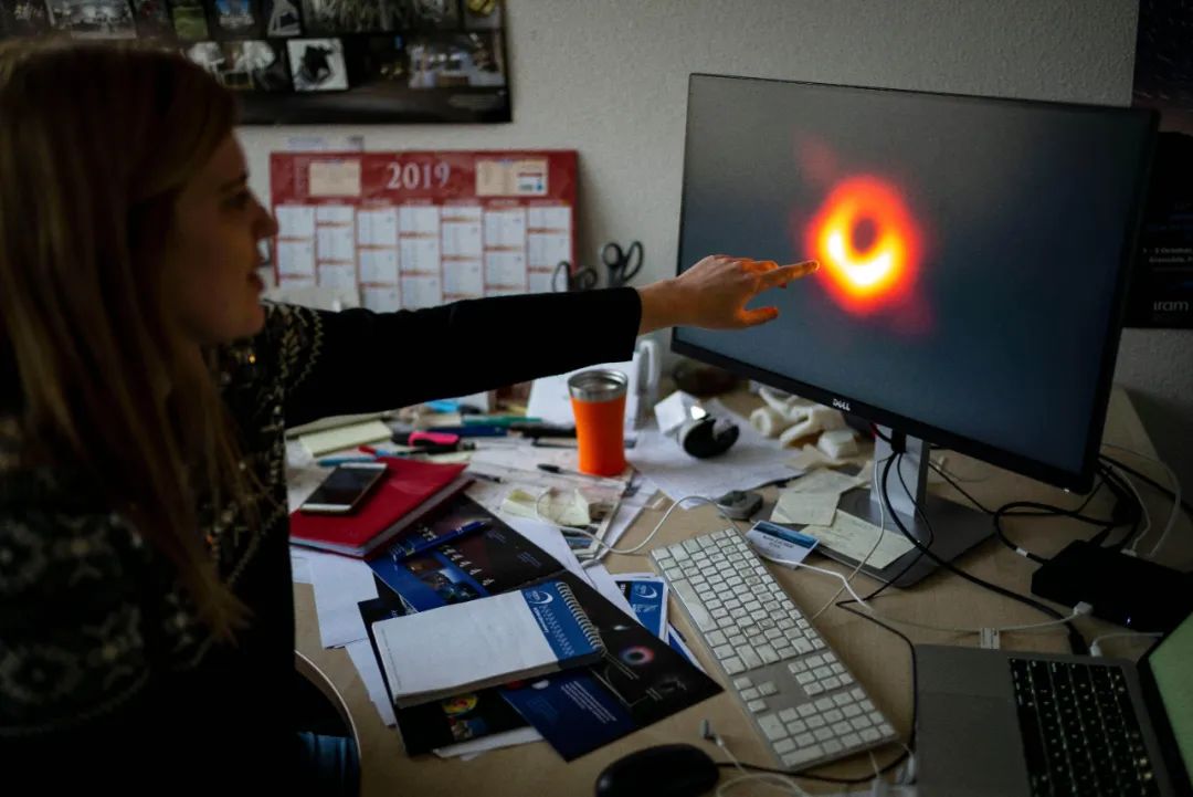 法国圣马丁代尔市毫米波射电天文学研究所的工作人员正在展示事件视界望远镜捕获的首张黑洞照片。这个黑洞位于“M87”星系的中心(视觉中国 供图)