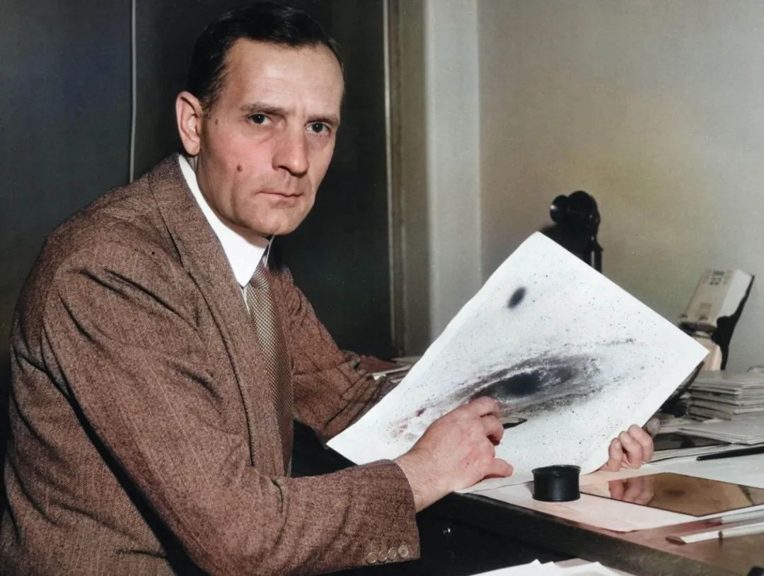 约1940年,埃德温·哈勃手拿一张星系图像(视觉中国 供图)