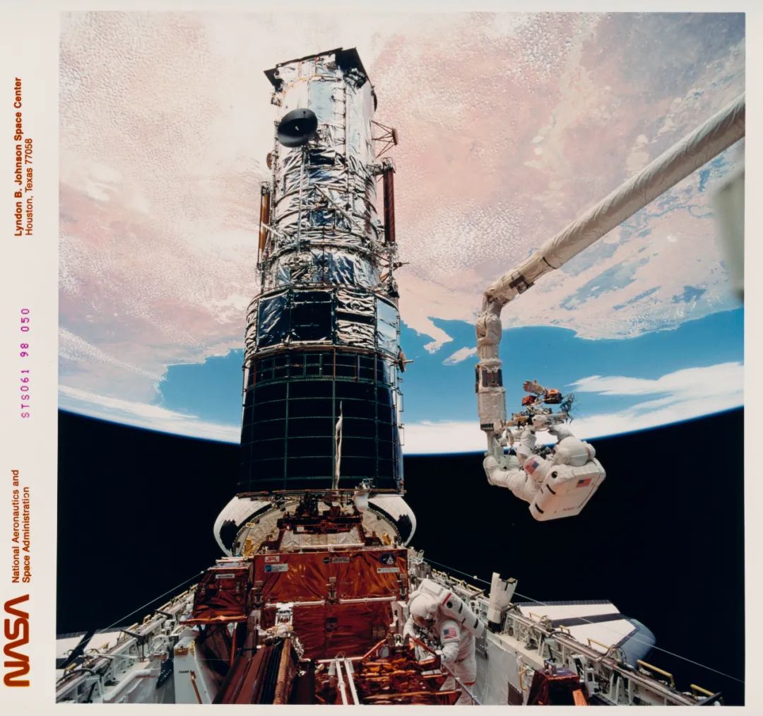 1993年,美国宇航员斯托里·马斯格雷夫(右)锚定在“奋进”号航天飞机机械臂上,正准备被升至哈勃空间望远镜顶部进行维护任务