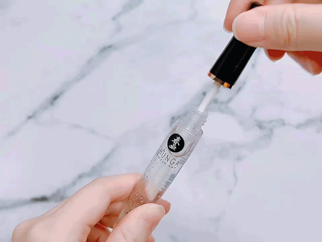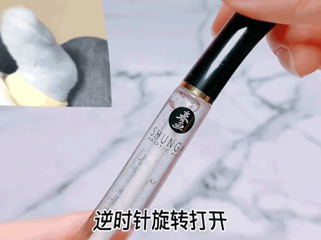 逆时针旋转拔出刷头,唇蜜的质地就像是透明的润唇膏,涂抹的时候很顺滑,也不油腻,唇蜜里面有少量闪片bulingbuling的。