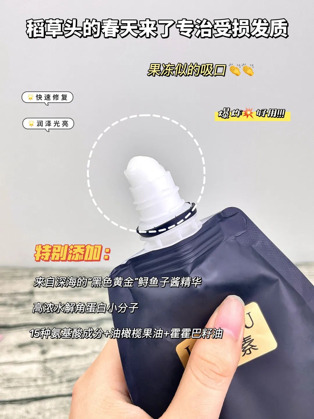 清爽不黏腻,精华肉眼可见爆珠,抹在头发上直接吸收!