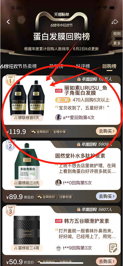 天猫护发类回购榜单𝐓𝐎𝐏𝟭💥