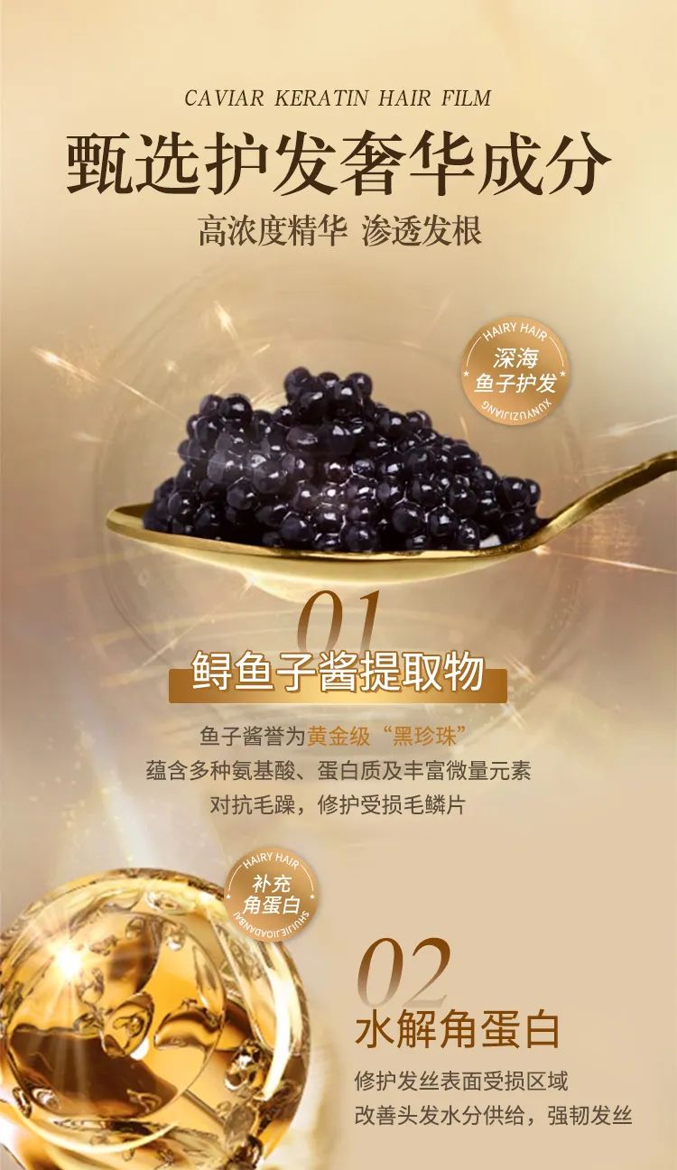 精选鲟鱼子酱提取物能够深入发芯补充养分,修护破损毛的磷片,锁住水分及养分,帮助头发提高秀发抵抗力,让秀发从根源处得到呵护!
