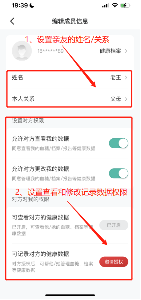 ①邀请亲友时,可以在【家庭管理】中设置亲友信息:姓名、与本人的关系及是否允许对方查看我的数据、是否允许对方修改我的数据权限;