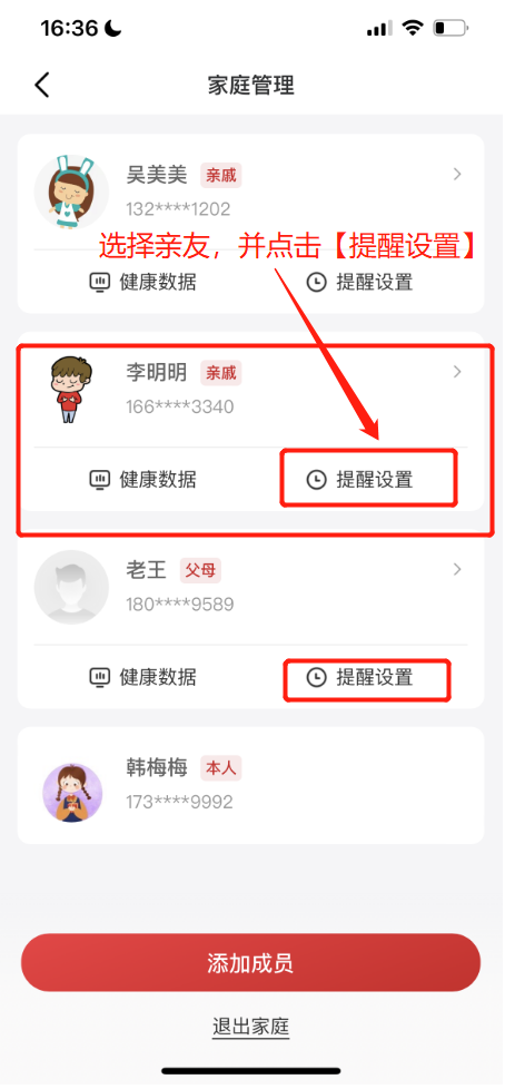 邀请亲友时,可以直接设置亲友权限,亲友加入后可以在【家庭管理】列表内点击【提醒设置】;