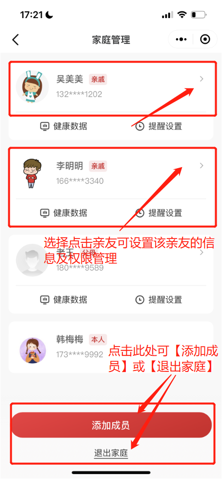 ②亲友加入后,可以在【家庭管理】的亲友列表中,管理亲友信息,邀请成员加入或者退出家庭。