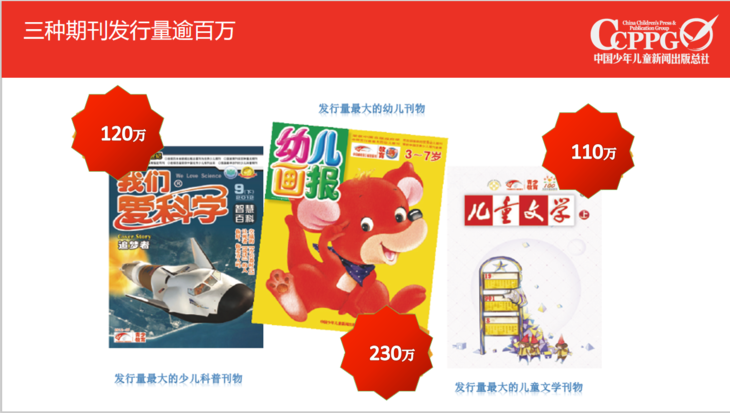中少总社编辑出版《婴儿画报》《幼儿画报》《嘟嘟熊画报》等5种报纸和13种期刊,每年出版1500种图书、多款数字出版物、视频、游戏。