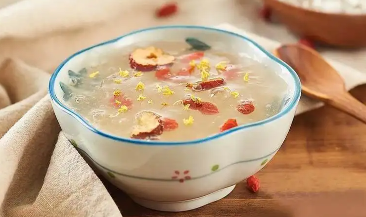 取适量的银耳,再加上枸杞、莲子等和葛根粉一起放入锅中熬煮,美味又有营养的银耳葛粉粥好看又好喝~
