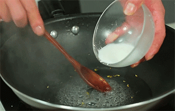 3、加入200毫升刚烧开的沸水,边加边迅速搅拌至透明糊状。