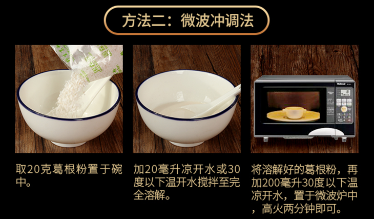 吃法也非常简单,葛根粉加一点凉水搅匀,再加入适量沸水冲开,搅拌成糊即可食用,或者20克葛根粉用温水化开后,放入微波炉里加热至透明食用。