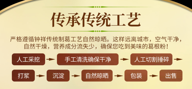 遵循传统制葛工艺,每一道工序都保证葛根粉的原汁原味,减少营养成分的流失。