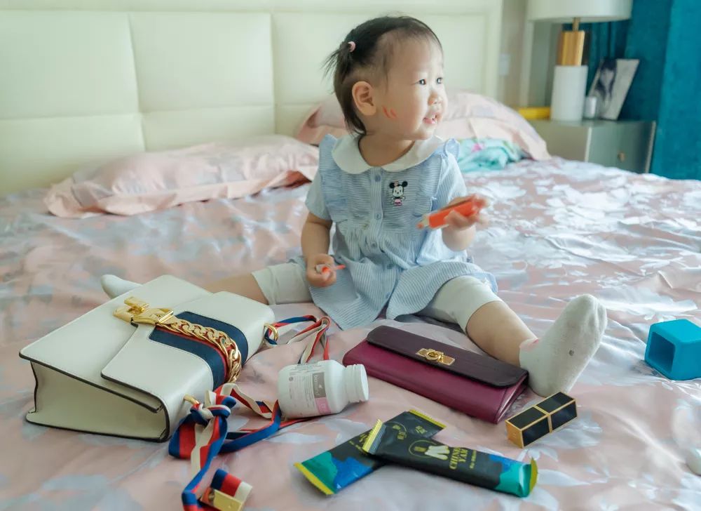 妈妈在化妆的时候,我也想涂上妈妈的口红。