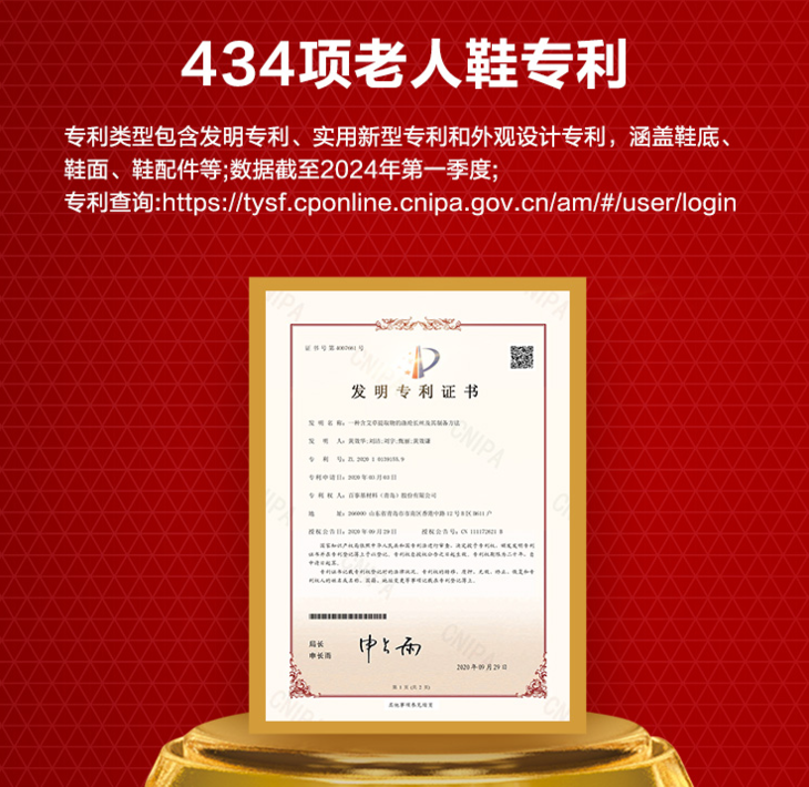 随着对老人穿鞋需求的不断挖掘,足力健老人鞋在鞋面、鞋底、鞋配件等方面,先后已获发明专利、实用新型、外观设计等434项老人鞋专利,通过研发满足了老人穿鞋需求,解决了老人穿鞋的问题