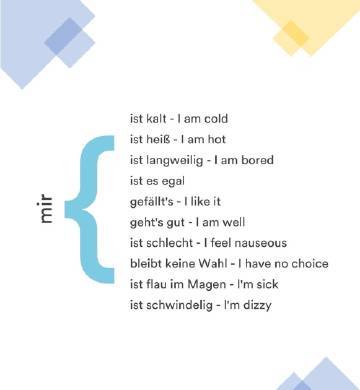 这句话里,虽然中文以“我”作主语,但是德语的逻辑是,天气是冷的,第三格表示天气“对我来说”冷。而如果用Ich bin kalt.,表达的则是”我是冷的“,可能会被误认为铁石心肠、冷若冰霜。除了这个句子以外,德语中还有很多情境会用到第三格,看看图片里的句子你是不是都能看明白呢