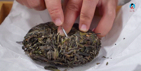 因是小饼,在撬茶时受力面积小会比较容易撬碎,这里我们一只手拉住饼的一边,另一只手先把茶针从饼心窝窝的地方向外插入要插到边缘,连续3-4次,最后一针手腕上抬将茶块撬起来。