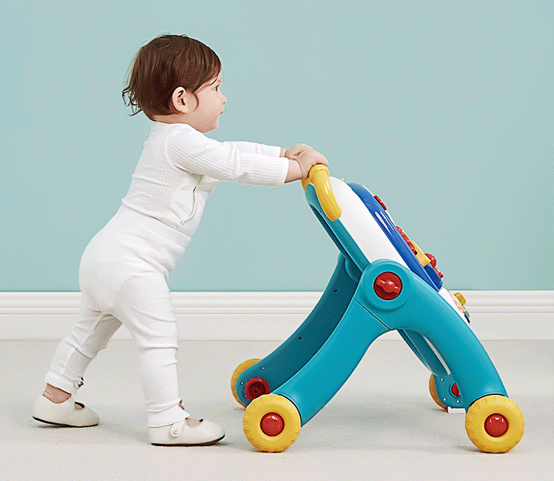 手推助步车:12-15个月时,提供稳固的推车让宝宝推着走。推物能提供动态支撑,帮助宝宝体会迈步的动量,同时锻炼平衡和协调能力。
