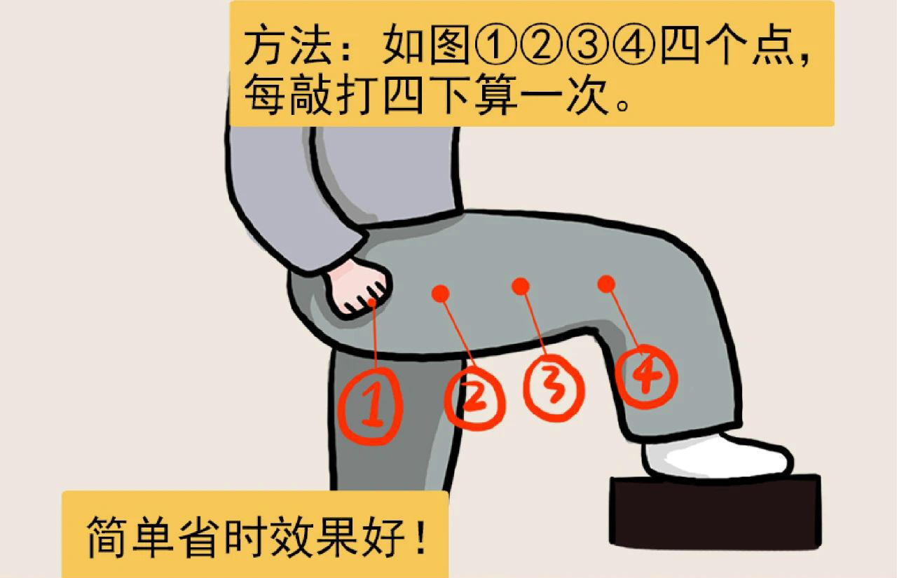 每天在大腿外侧的四个穴位点,用力敲打,每敲打四下算一次,每天敲左右大腿各五十次,也就是左右各两百下。由于大腿肌肉和脂肪都很厚,所以必须用力,而且以每秒大约两下的节奏敲,才能有效刺激穴位。