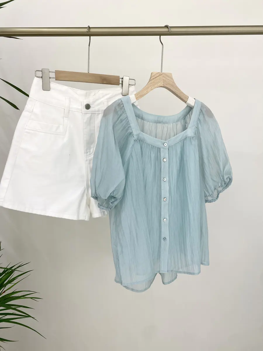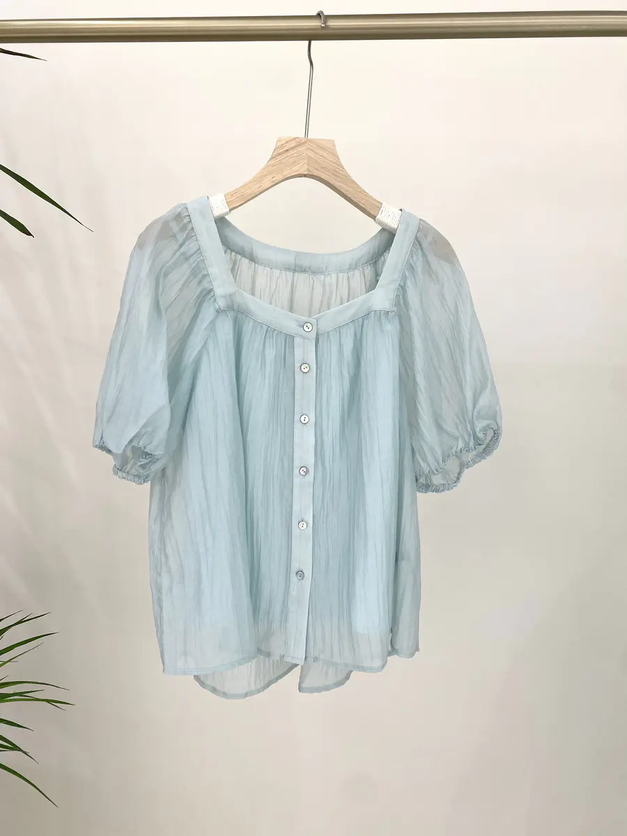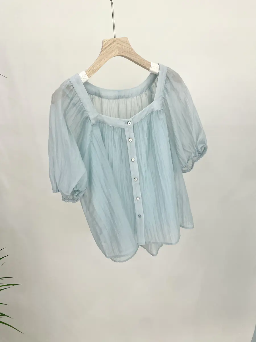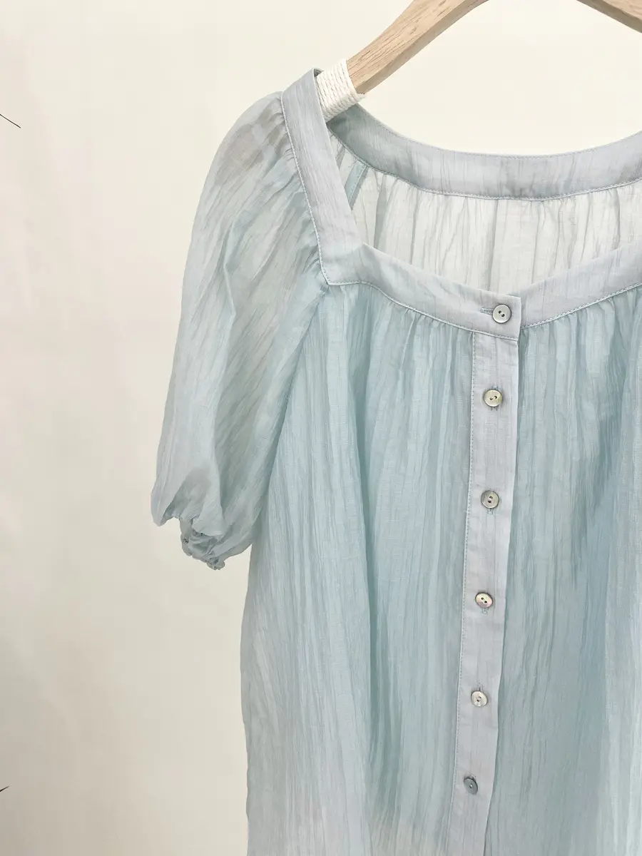 小衫主要走法式风情,经典的法式方领,结合微微抽褶的大袖笼,松弛、浪漫、无束缚,搭配白色系单品最适合不�