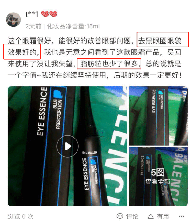 “我平时熬夜频繁,眼周有黑眼圈很重,看着特别疲惫,没有精神。这款眼霜当时是被林允安利时发现的,本来没报什么希望,结果才用了3天,黑眼圈就已经淡的看不出来了,现在我身边很多妹子都被我安利了。“
