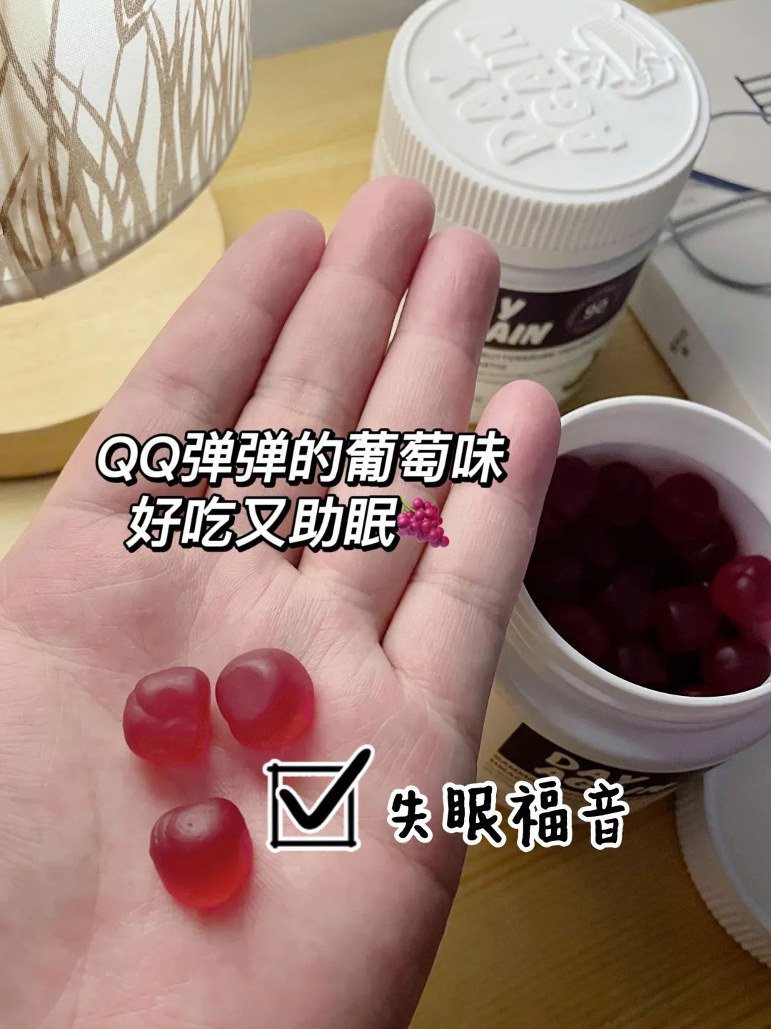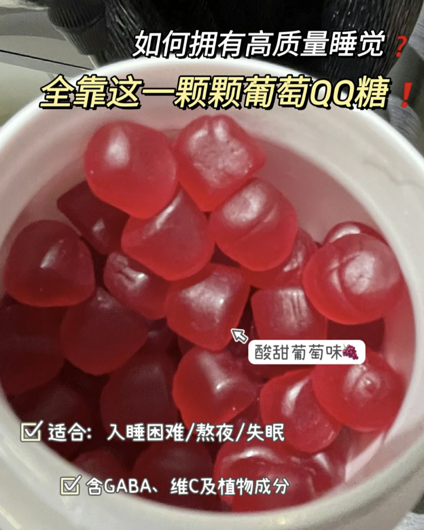 口感就像吃葡萄味的QQ糖一样,酸酸甜甜。两颗下肚,不到20分钟就困到不行,眼皮都睁不开的那种。
