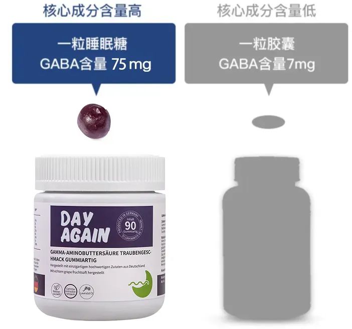 经检测,DAY AGAIN睡眠软糖核心成分GABA含量是远远高于同类产品。每粒软糖GABA足足75mg👍,在效果方面毋庸置疑!
