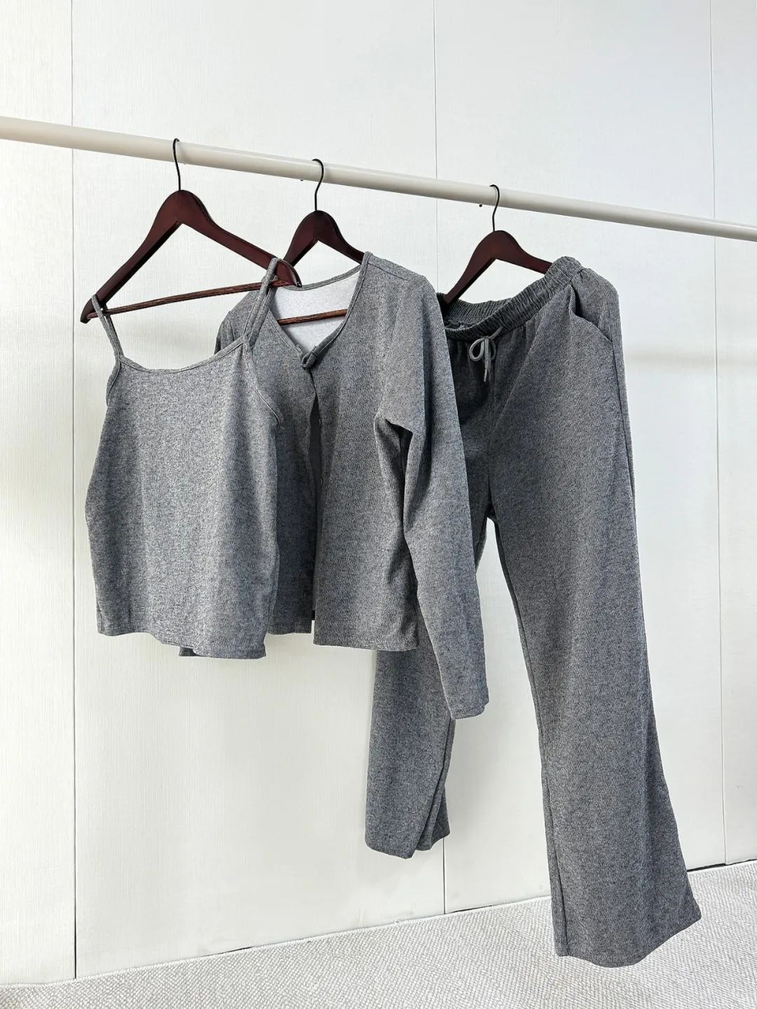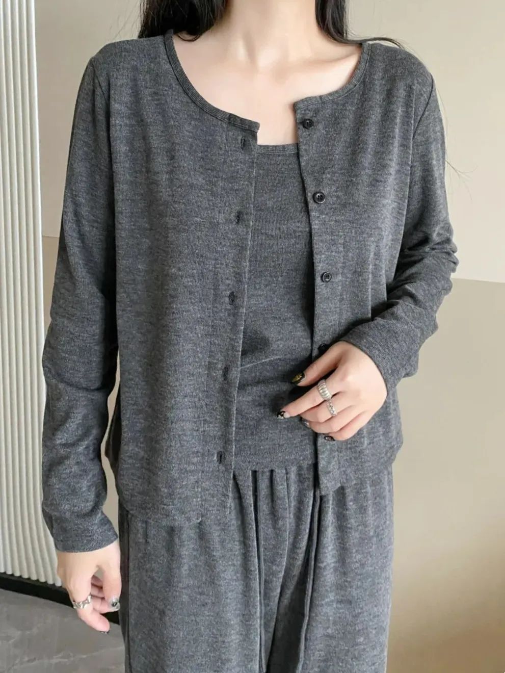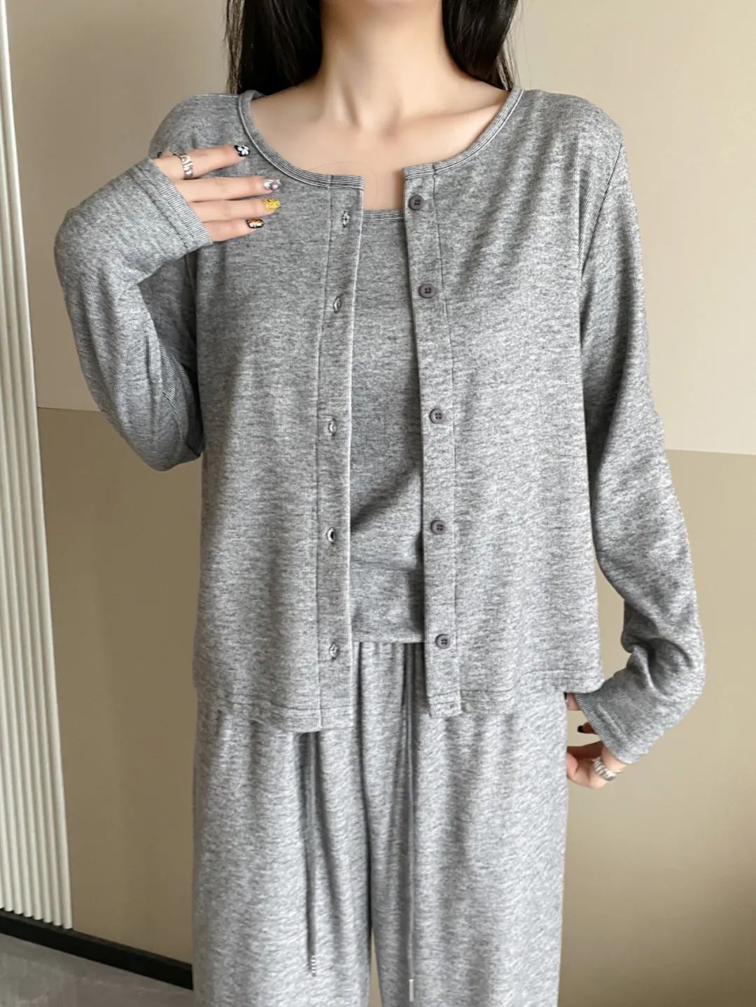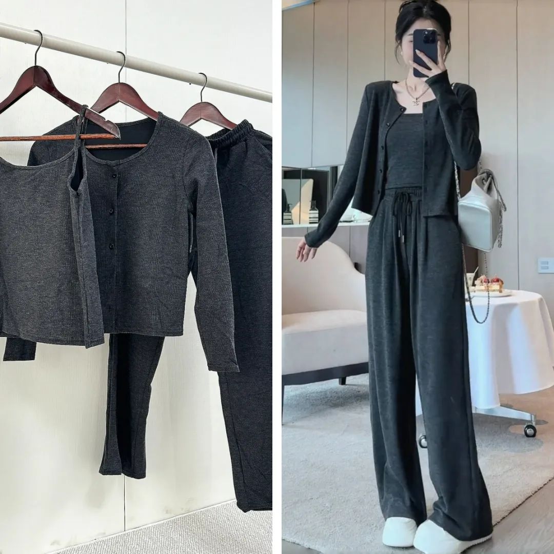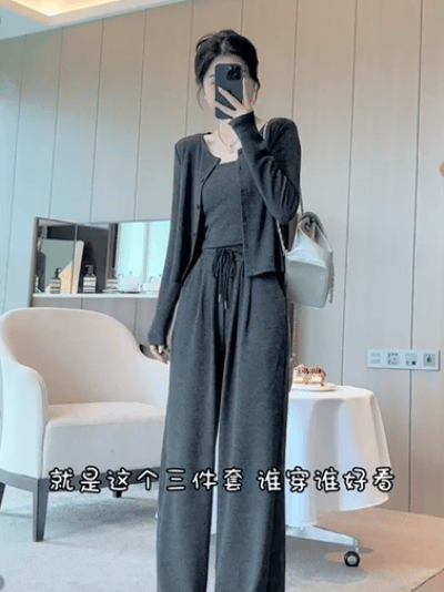 透气性也很好,内搭吊带+外套开衫一起穿也不会觉得闷热,很亲肤。裸感亲肤、质感高级,这样0缺点的套装,谁不爱啊?!不仅是面料、版型极好,糯米套装在裁剪上也处处体现出品牌用心宠粉的心意~开衫的下摆、袖口、领口等部位紧密精致走线,尽显精工细作之感。耐磨性很好,不用担心穿着穿着会勾丝、起球,穿个3、4年都不成问题。而且弹性也灰常大哦,微胖的小仙女穿也不会觉得有束缚感。同事看到样品后,都一直狂夸质感不输商场里的品牌套装~有大牌质感的服装都是这样吧。看着不起眼,穿上却很抬人,不会出现衣服穿人的问题。我强烈推荐大家买套装,套装穿起来又飒又温柔,上班、谈生意、逛gai、下午茶,想不出有什么场合不能穿。而且它不仅可以整套穿,套装里的开衫、阔腿裤、背心,哪怕单拎出来穿,也超百搭~比如圆领开衫,早在上世纪五六十年代,“基础款开衫”就开始流行了。奥黛丽·赫本就很爱穿,用来突显她身上高贵优雅的气质。日常穿搭,牛仔裤、长裤、半裙…...只要是衣柜里随便拿出来的下装,都能和它搭,而且风格满满。