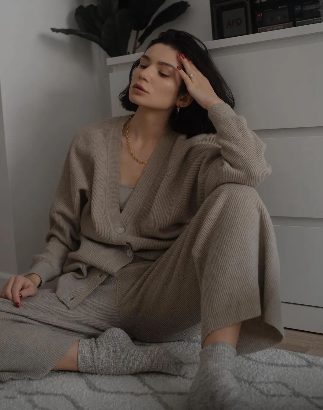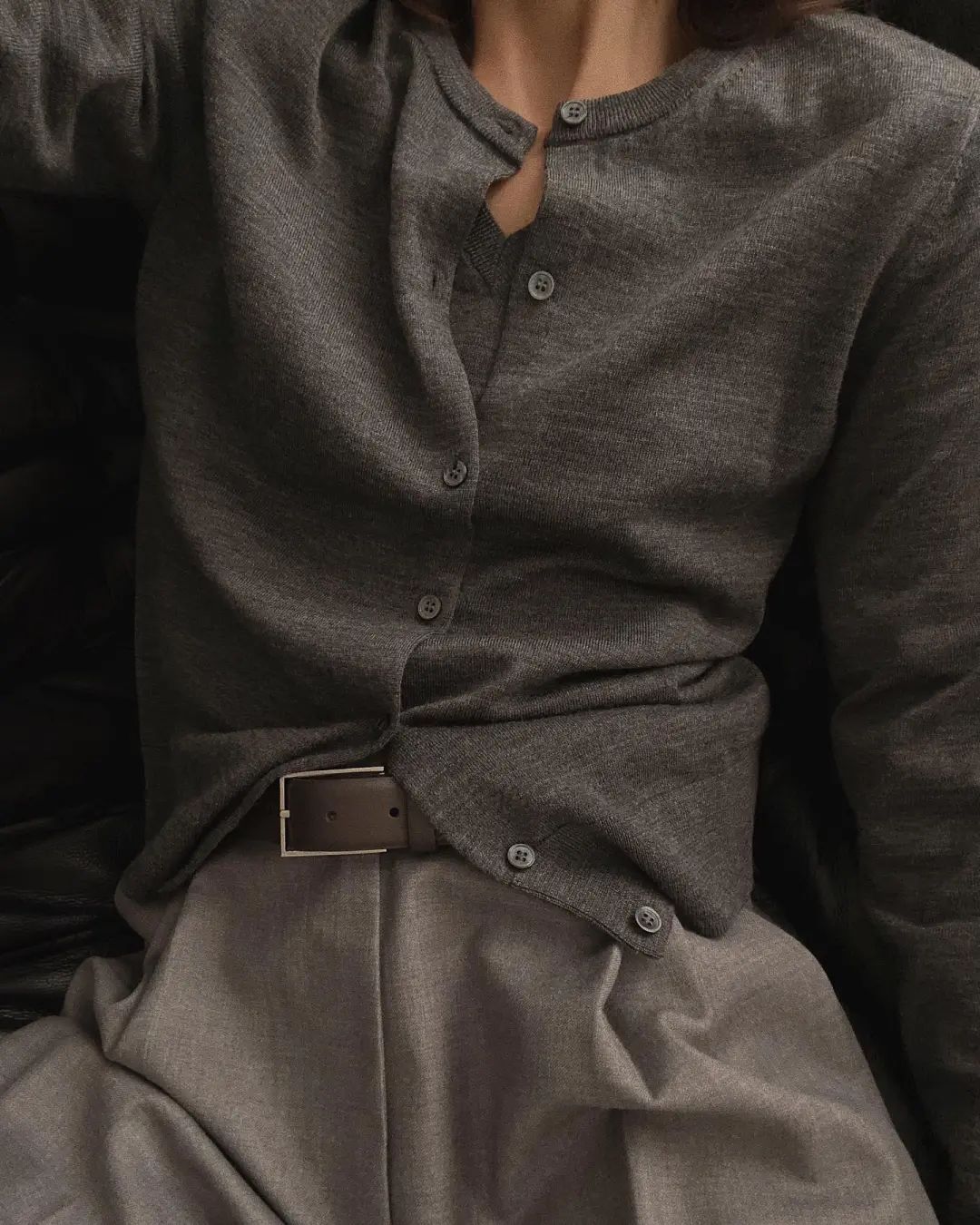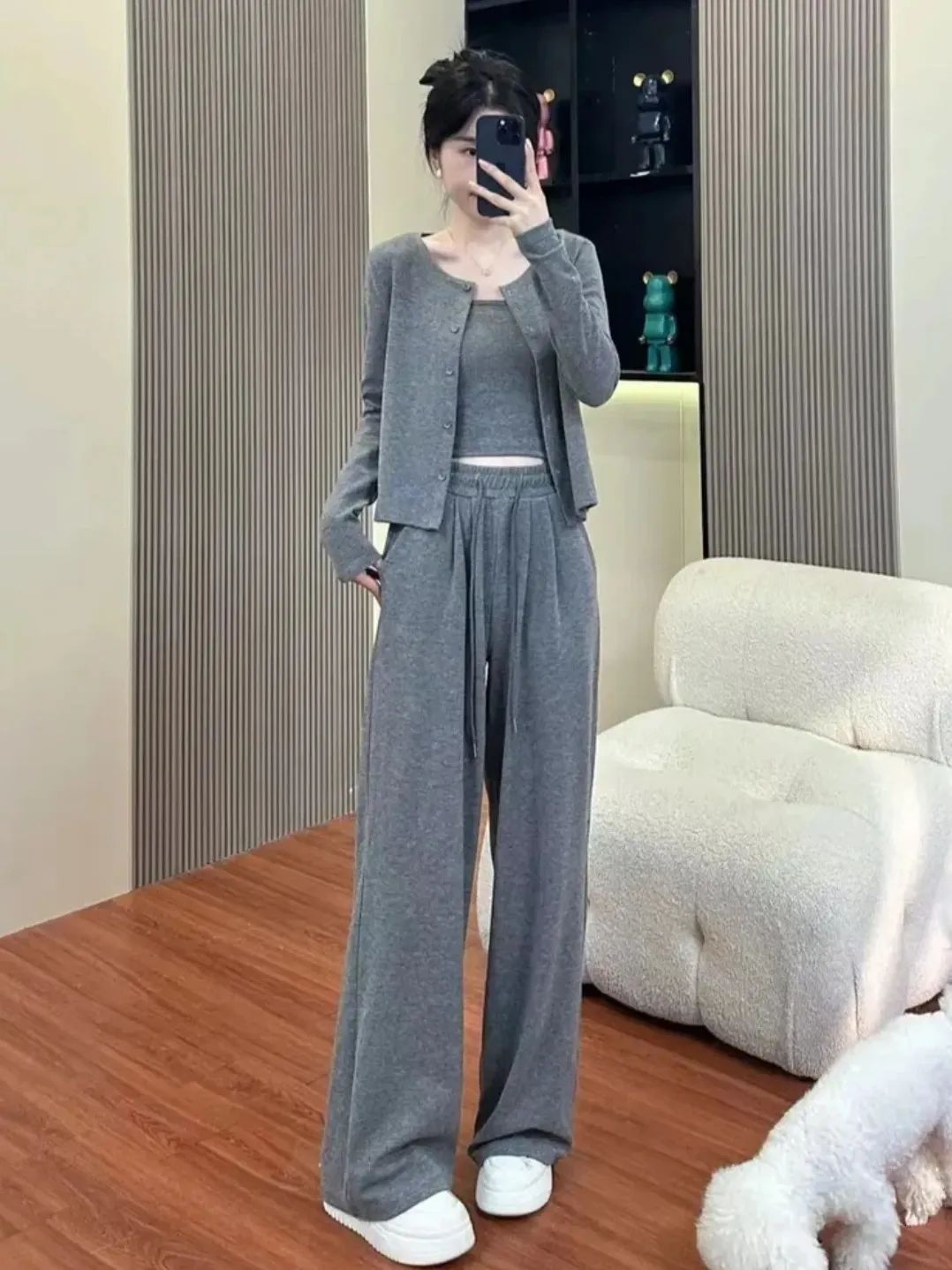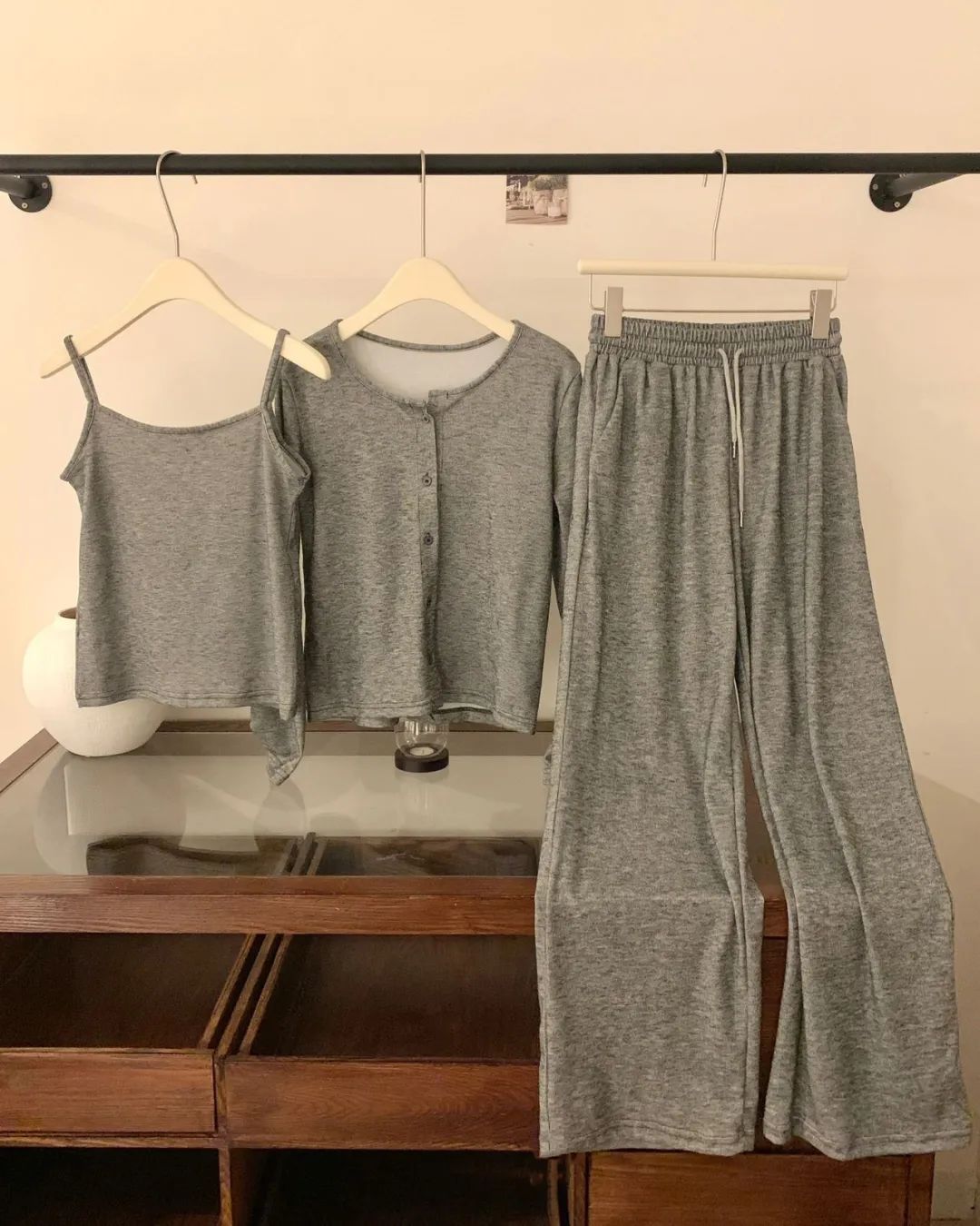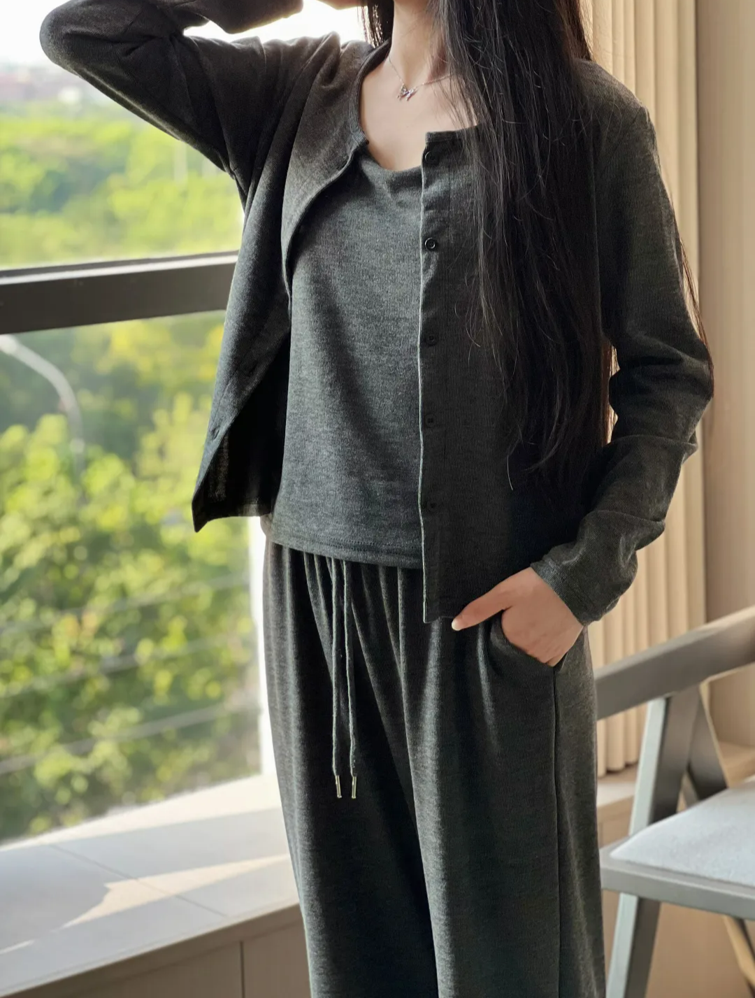 透气性也很好,内搭吊带+外套开衫一起穿也不会觉得闷热,很亲肤。裸感亲肤、质感高级,这样0缺点的套装,谁不爱啊?!不仅是面料、版型极好,糯米套装在裁剪上也处处体现出品牌用心宠粉的心意~开衫的下摆、袖口、领口等部位紧密精致走线,尽显精工细作之感。耐磨性很好,不用担心穿着穿着会勾丝、起球,穿个3、4年都不成问题。而且弹性也灰常大哦,微胖的小仙女穿也不会觉得有束缚感。同事看到样品后,都一直狂夸质感不输商场里的品牌套装~有大牌质感的服装都是这样吧。看着不起眼,穿上却很抬人,不会出现衣服穿人的问题。我强烈推荐大家买套装,套装穿起来又飒又温柔,上班、谈生意、逛gai、下午茶,想不出有什么场合不能穿。而且它不仅可以整套穿,套装里的开衫、阔腿裤、背心,哪怕单拎出来穿,也超百搭~比如圆领开衫,早在上世纪五六十年代,“基础款开衫”就开始流行了。奥黛丽·赫本就很爱穿,用来突显她身上高贵优雅的气质。日常穿搭,牛仔裤、长裤、半裙…...只要是衣柜里随便拿出来的下装,都能和它搭,而且风格满满。