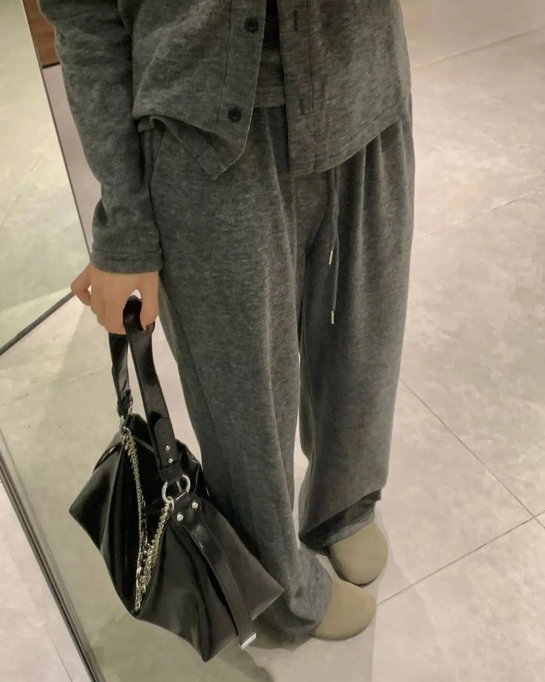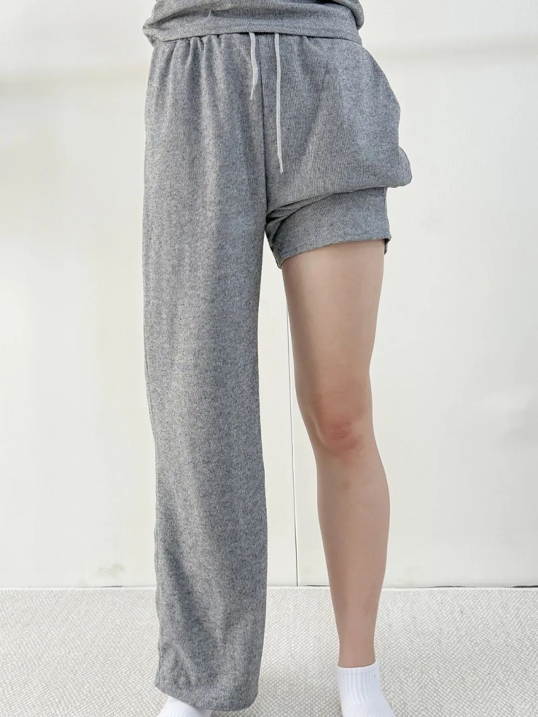 套装这种单品,看似很百搭很适合懒人,但面料也不能松懈,不然会穿出家居服的既视感。它表面看上去有点儿像那种螺纹材质的,有很清晰的肌理感。上手的触感,那叫一个软糯舒服。穿过,你就会懂得什么叫轻如羽毛、软如云朵~面料的厚度刚刚好,不薄也不厚,正适合接下来的早秋季节。