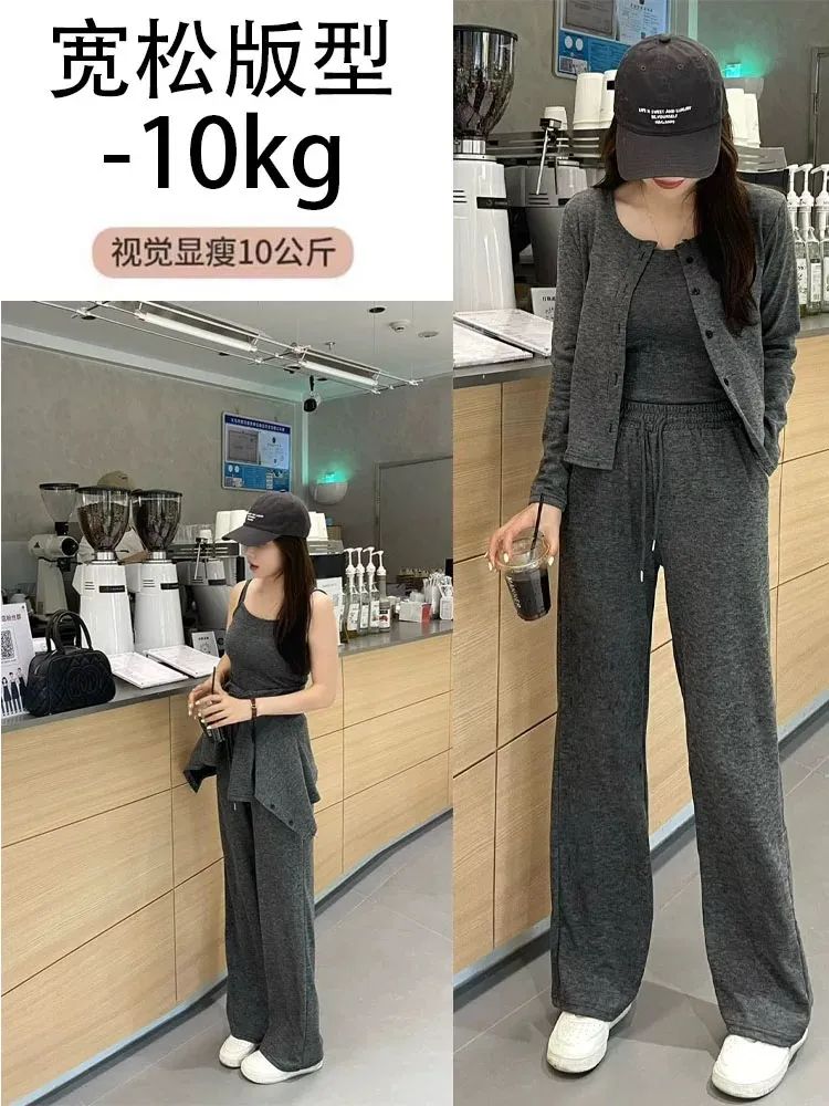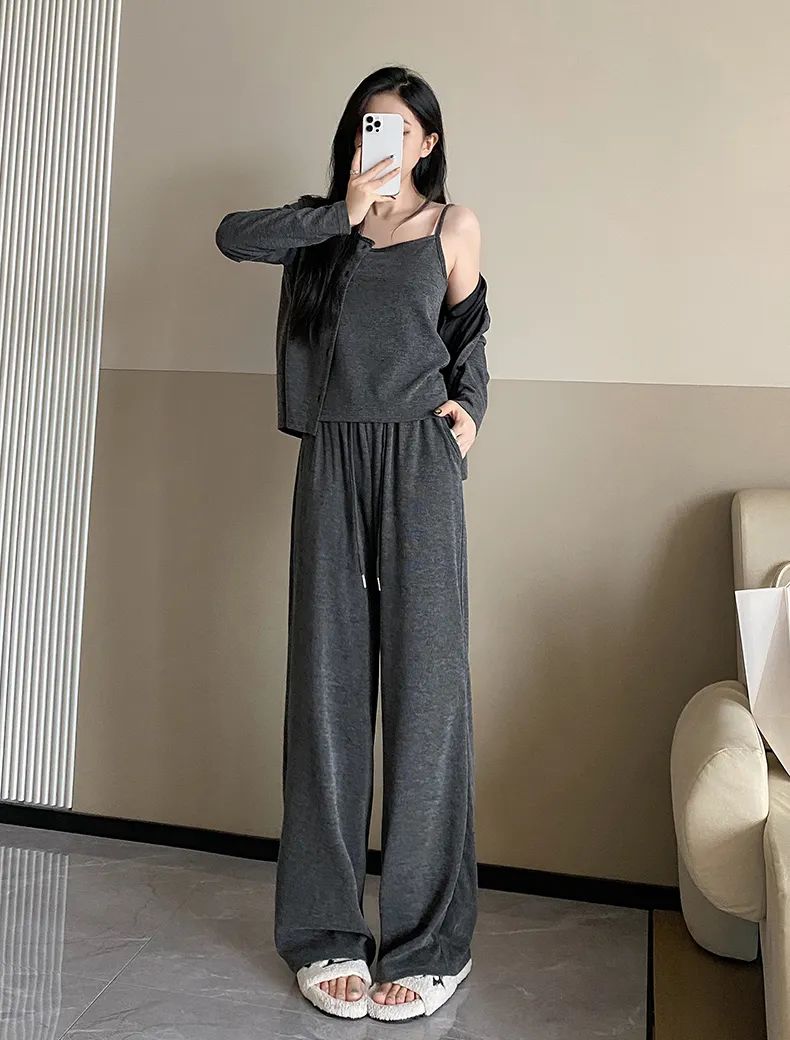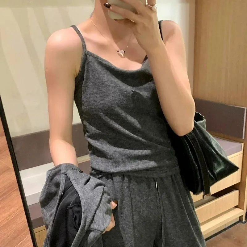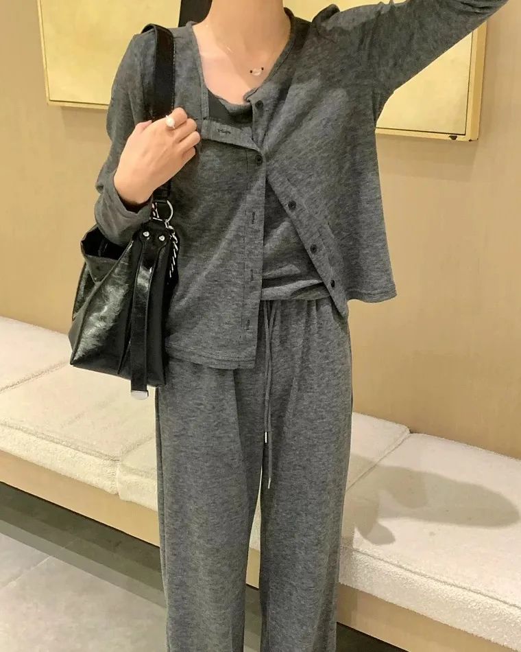 背心的利用率更不用说了,不仅能单独外穿还能做内搭。也可以试试「吊带+外套」的组合,这也是目前许多潮人的穿法:上身随便搭衬衫、T恤、外套,看起来就特舒服、高级,有种说不出来的温柔感~套装的颜色,给大家选了低调又显气质的深灰色、浅灰色 2 种。