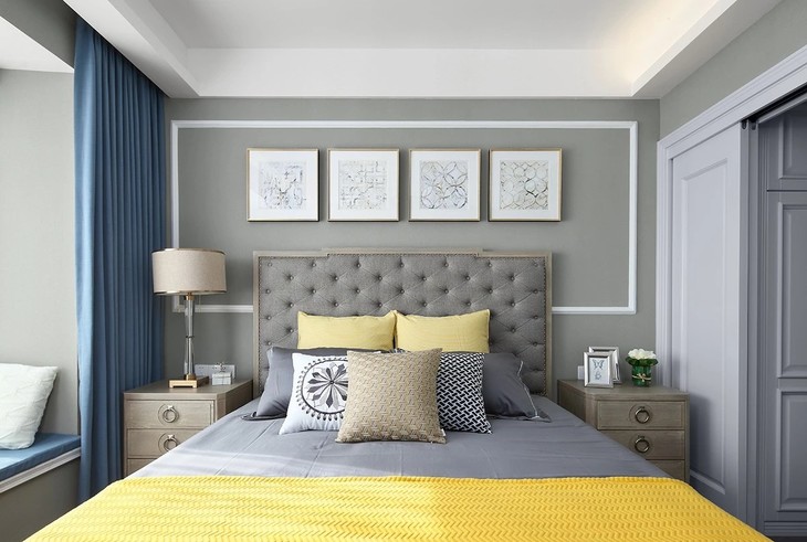 主卧的空间用中性灰与浅木色作为主调,以沉静优雅蓝色的窗帘与床品加以点缀。透过巧妙的空间细节, 打造出自然的光影感受,整体温柔的色调塑造舒缓解压的睡眠氛围。