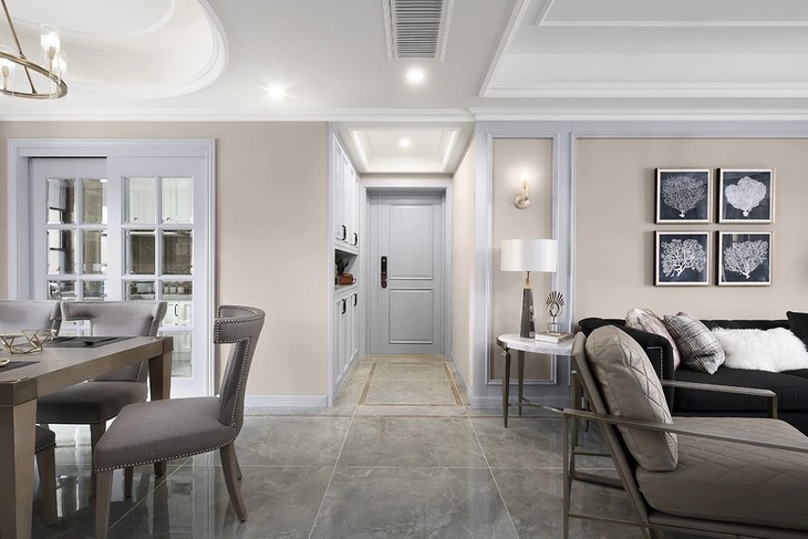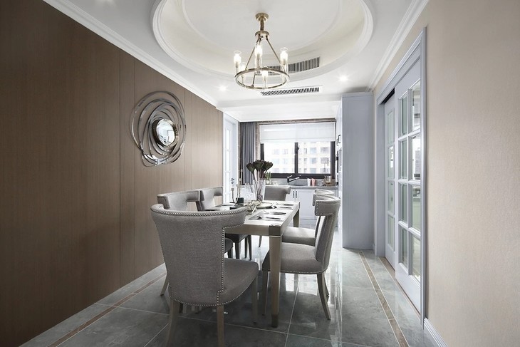 设计师将北阳台内扩至餐厅,新添西厨,增加餐厅空间感的作用,也恰到好处的规避了洗衣房的位置,使空间呈现出视觉上的美感和统一。用餐区注重线条感的营造。餐桌选用采用简洁的长方形,别致的拉丝金属装饰,搭配同纹理餐椅具有轻盈的纤细线,令视觉感延续。
