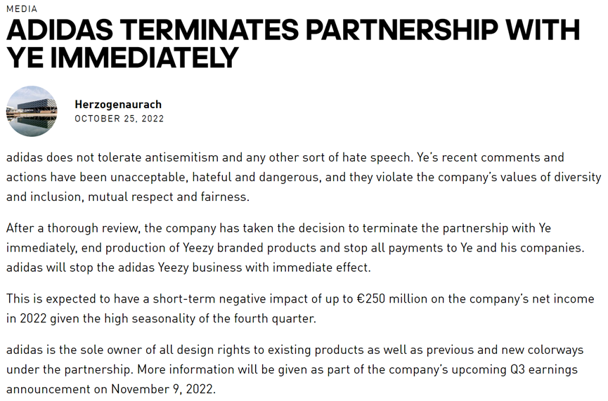 声明表示:侃爷最近的言论和行为是不可接受的、可恨的、危险的,它们违反了公司多元化、包容、相互尊重和公平的价值观,停止生产合作鞋款,并停止向侃爷及其公司支付所有款项。