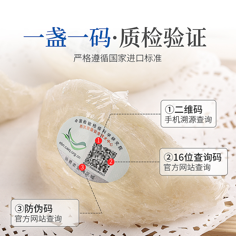 成品过程中,庄民燕窝严格检验检测,讲究10道控菌工序。严格遵循国家检测标准,合格的入境检验检疫证明、检验报告。庄民还在产品包装上添加了二维码,产地信息可查询,进口信息可查询、检疫信息可查询,一盏一码,全程溯源,每一盏都是有“身份证”的燕窝,给每一位顾客安心和保障。