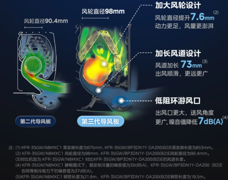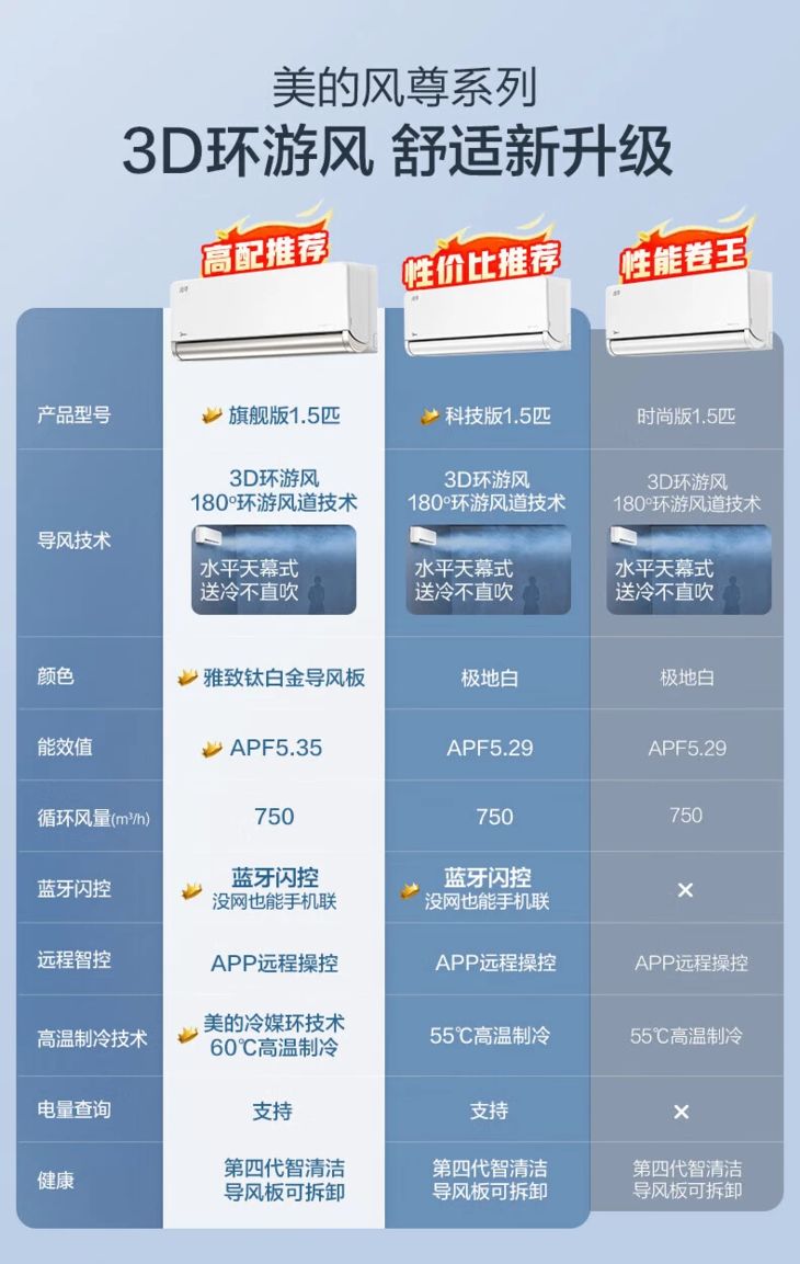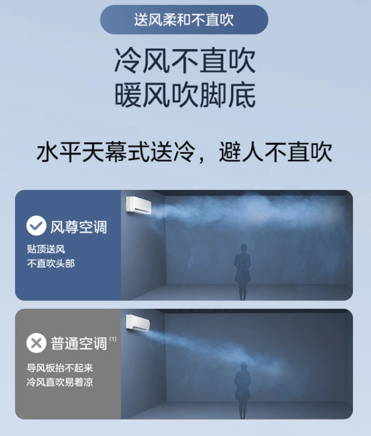 主打180°3D环游风设计:天幕式送风,地毯式制热,制冷制热效果全面更加舒适~功能、功耗、风量等性能都提升了
