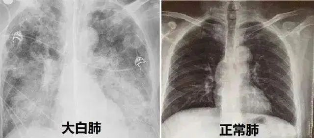正常的胸片肺呈黑色。如果肺里有炎症,痰液充斥肺泡后,胸片呈白色,这就大白肺!