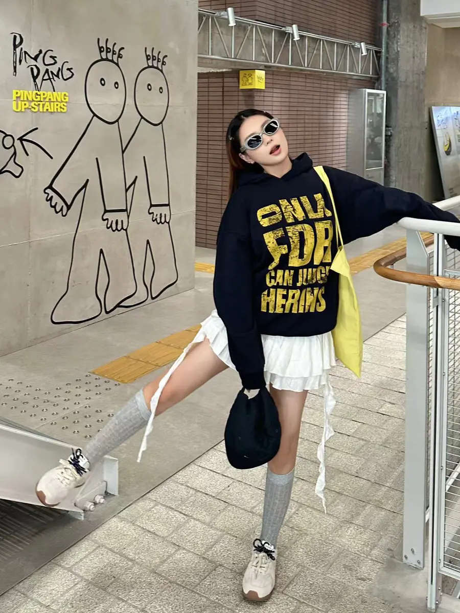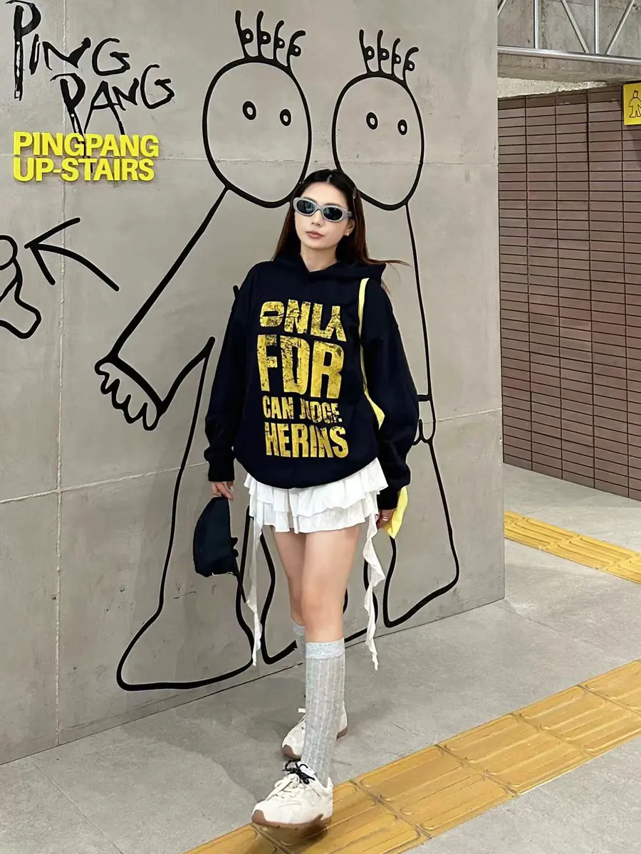 LOOK3. 美式复古卫衣+白色蛋糕短裙