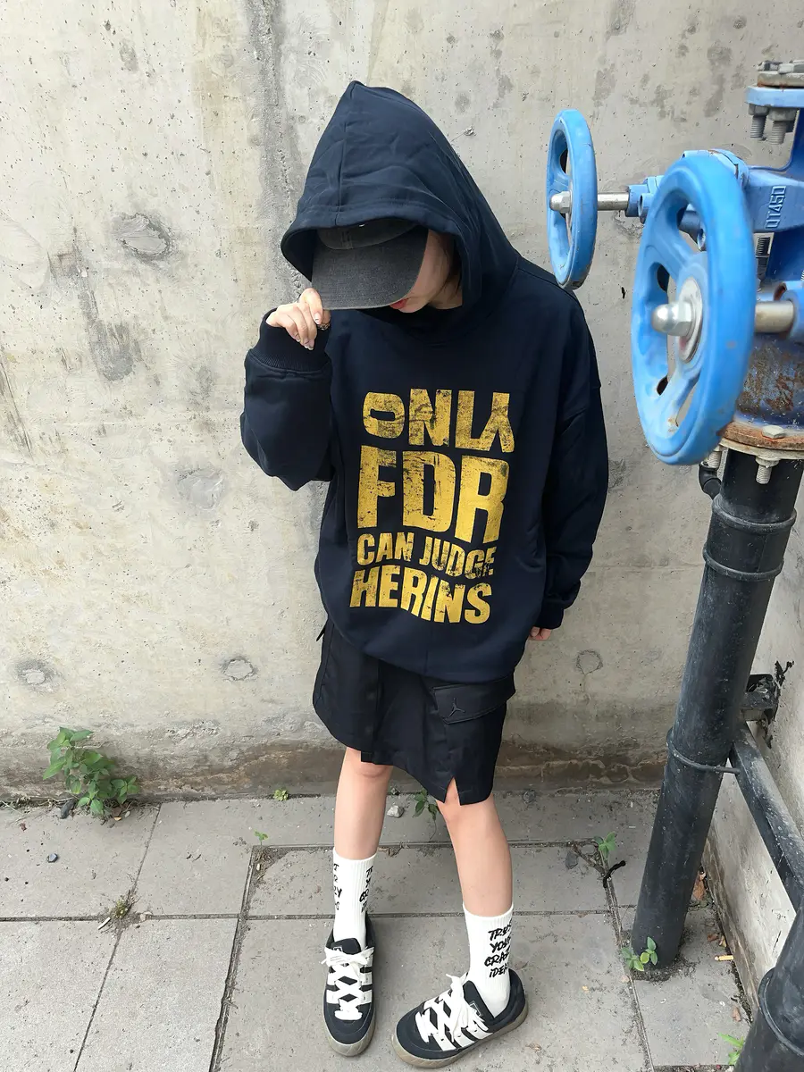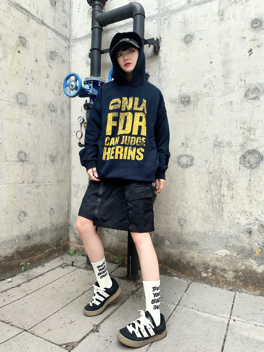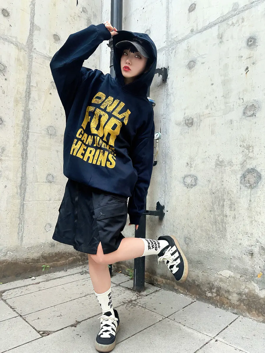LOOK2. 美式复古卫衣+工装短裙