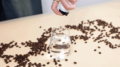 对准头部的小按钮,轻轻一按,只听噗嗤一声,咖啡液就被挤进杯子里了!