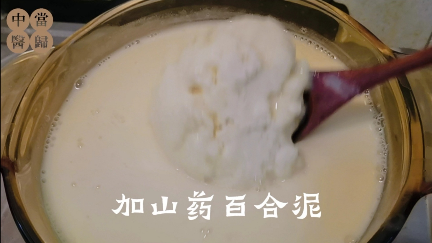 熬煮的米粥中,加入豆浆、山药泥和百合泥。
