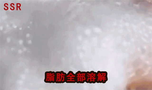将满是脂肪的猪油,倒进美藤果油中,搅拌1分钟,厚厚的猪油就被完全溶解了!