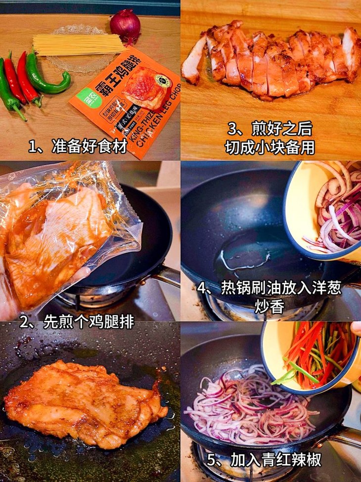 意面,青红辣椒,洋葱,霸王鸡腿排,黑胡椒粉,生抽,老抽,蚝油,玉米淀粉