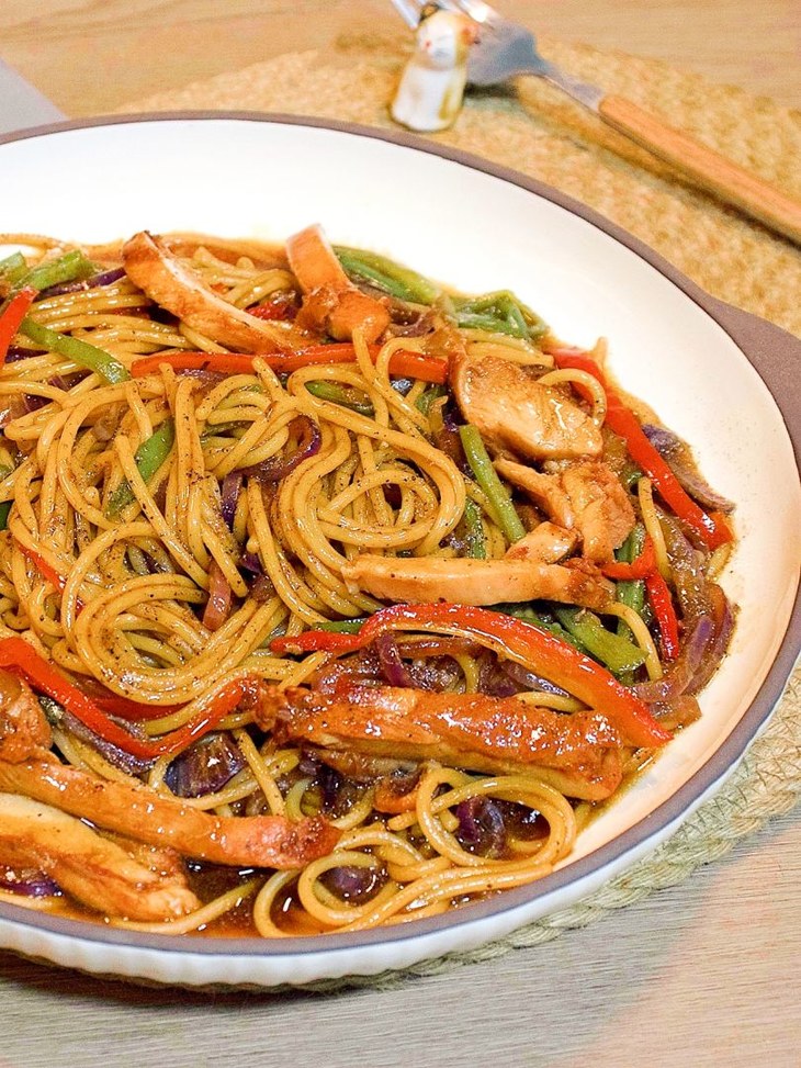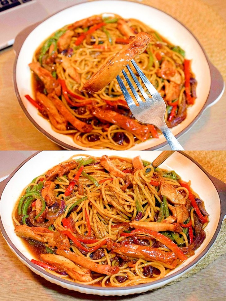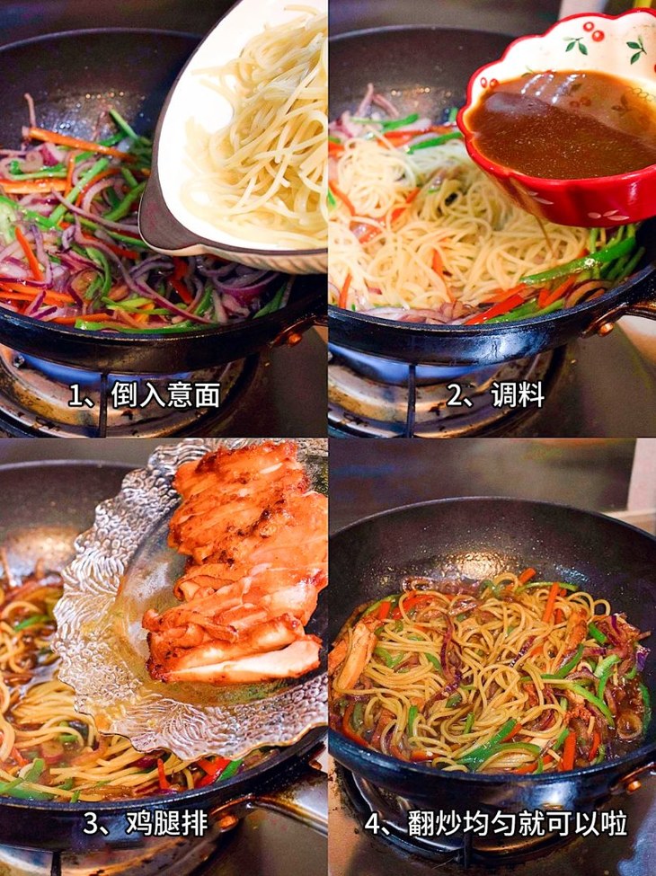 4⃣️热锅刷油放入洋葱炒香,加入青红辣椒翻炒均匀,加入煮好的意面,调料,烤好的鸡排,翻炒均匀就可以啦;