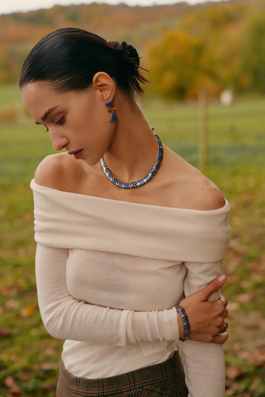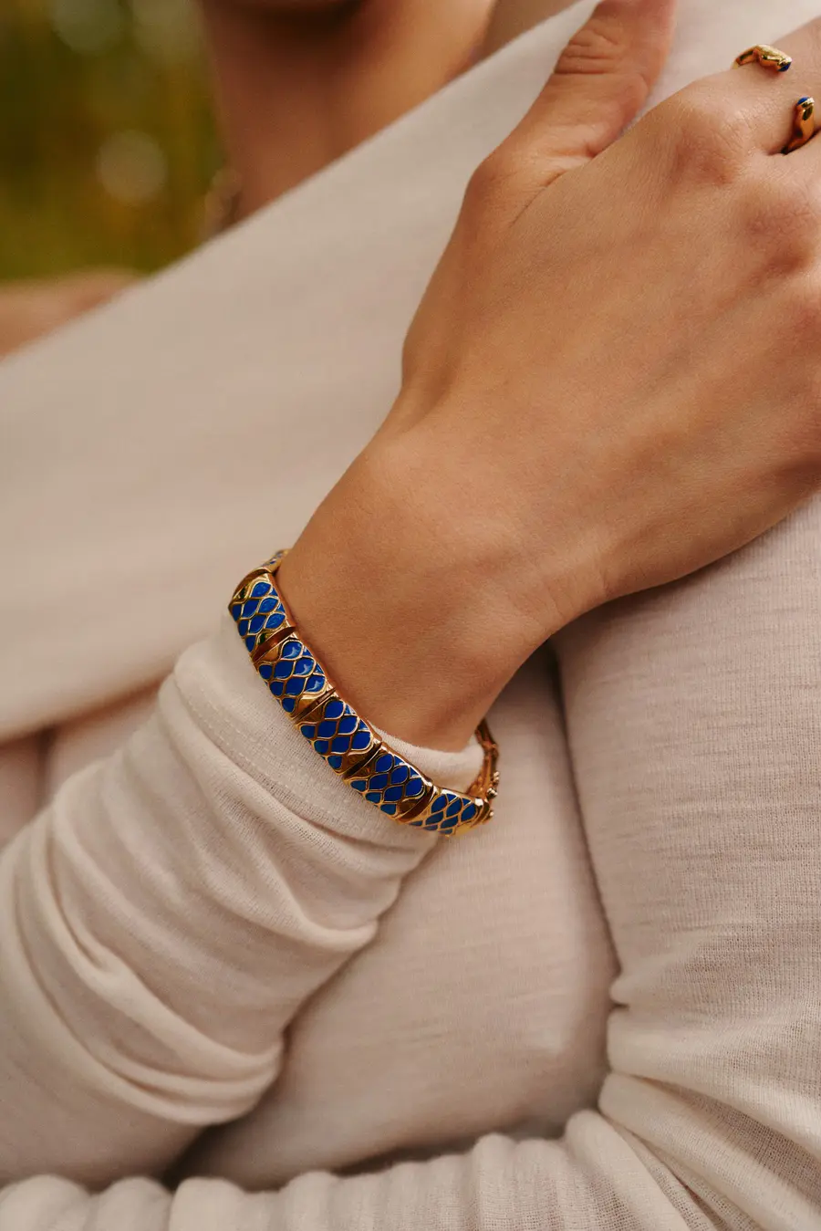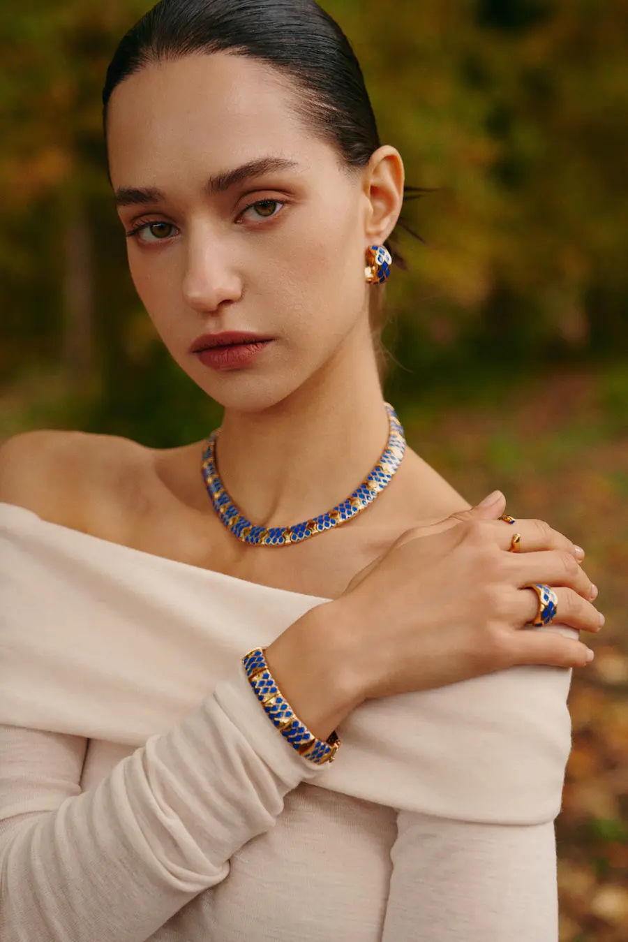 深邃宝蓝象征夜空与神秘能量,金色线条如神庙壁刻般环绕,呈现古文明的庄严与女性魅力的柔韧力量。细腻的比例与蜿蜒的节奏,让整件作品如护身符般贴合日常